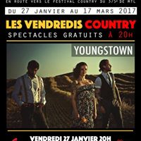 En route vers le Festival Country du 375e de Montréal Admission gratuite. Les vendredis à 20h. Réservations (514) 223-8116 27 janvier Youngstown 3 février Barren Acres 10 février Calamity Jane 17 février...